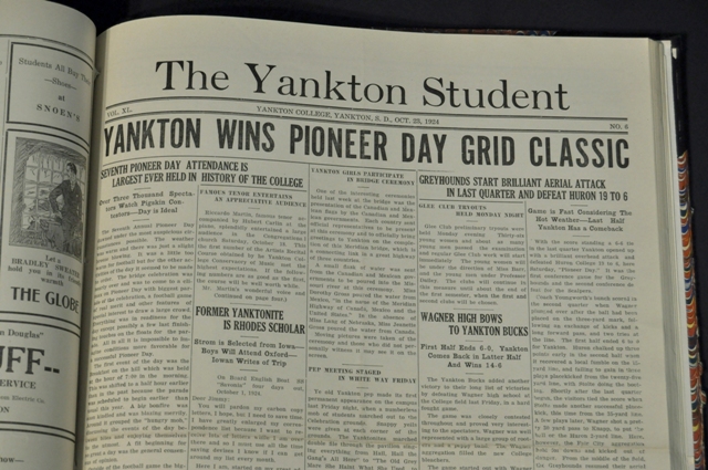 To properly tell the Yankton College story, a photographic timeline greets visitors when arriving at the Joseph & Sarah Ward Alumni & Educational Center of Yankton College on the 3rd floor of the Mead Museum. The display takes our visitors on a brief journey of the 103 year history of the college. The 4 Galleries and 2 conference rooms showcase Yankton College memorabilia on permanent and rotating display in museum quality display cases at the Joseph and Sarah Wood Ward Alumni & Education Center of Yankton College. Print Legacy Fundraising Brochure.